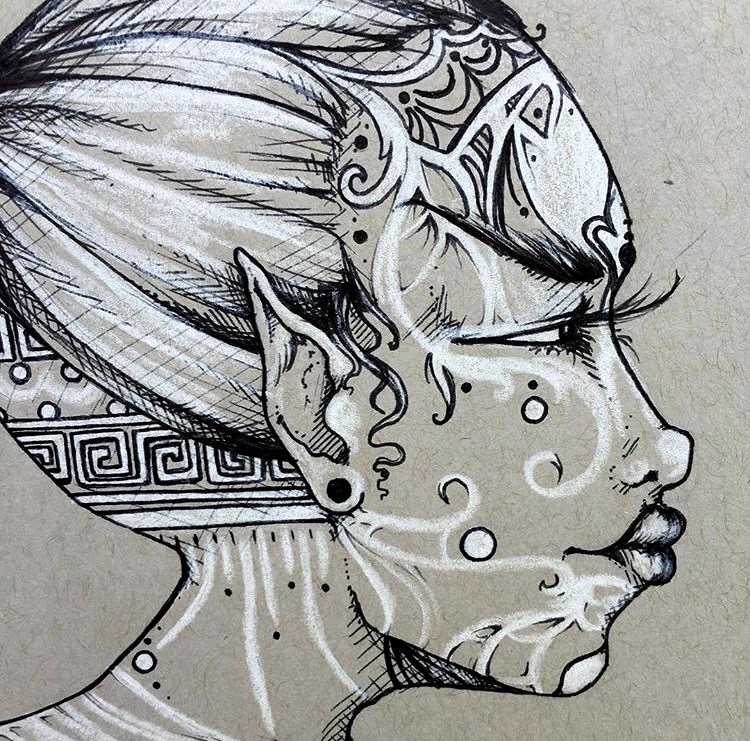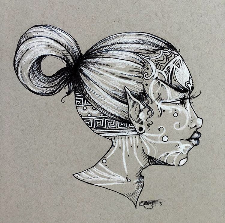 $30 for this elf portrait from 2015, now up for sale. Made on toned paper with black ink and white pencils. Paper measures 9x12" but the face image is about 6"x6". This is not a print, this is an original piece. Standard shipping charges apply.