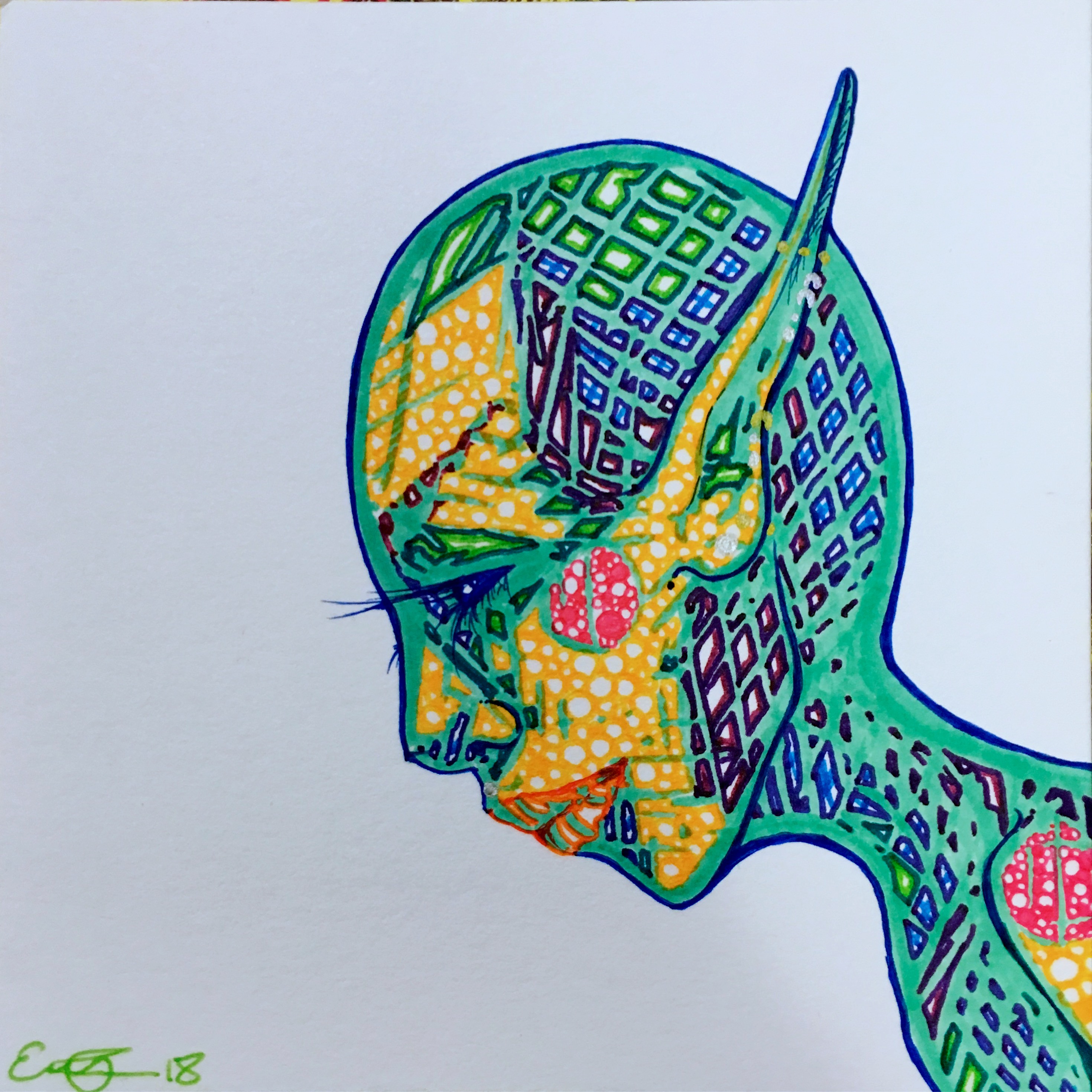 Mini Psychedelic Alien portraits are 4x4" and made with ink pens. This is an original piece, this is not a print. Standard shipping charges apply.