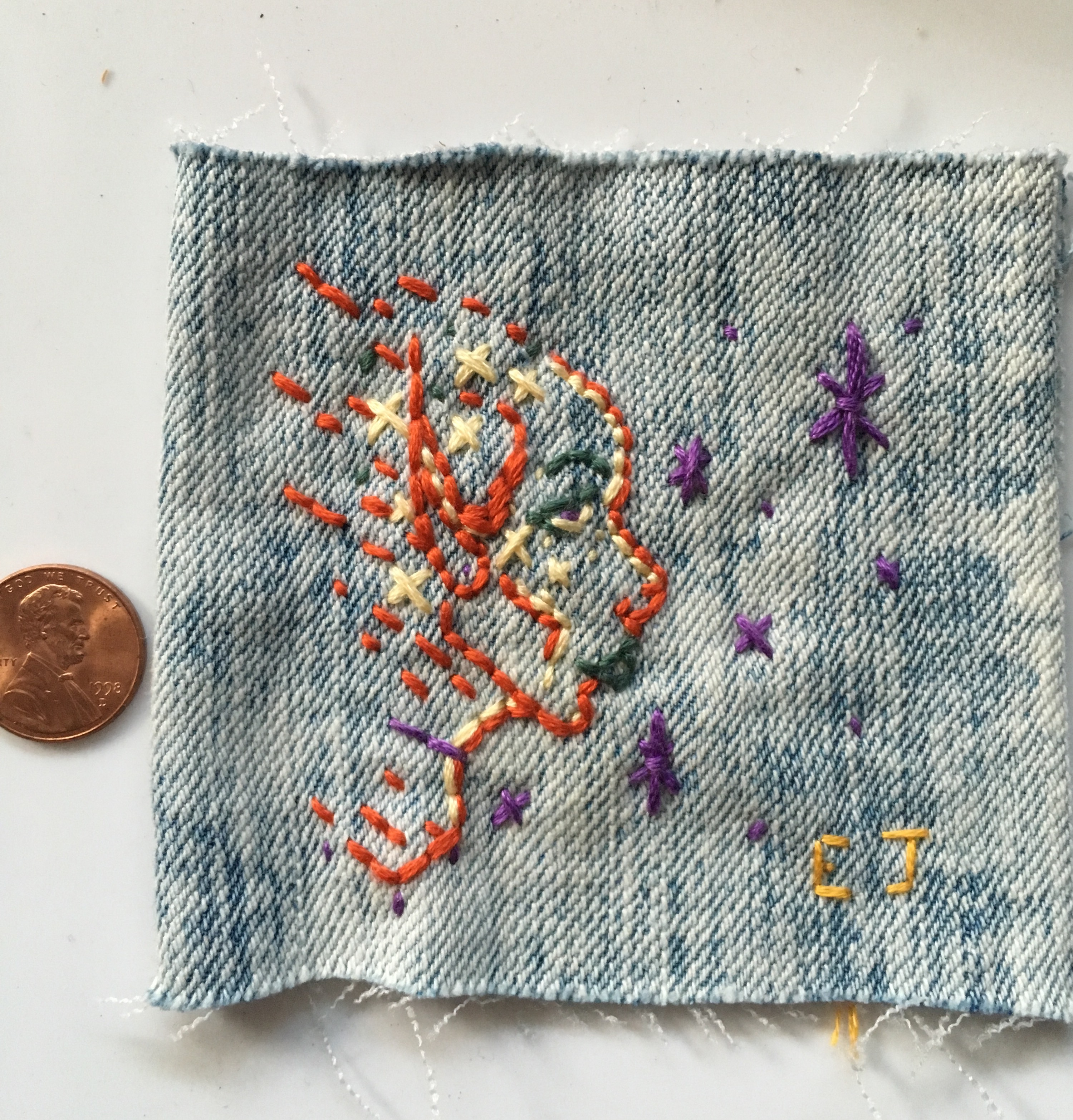 Made with scrap denim, some embroidery floss, this patch measures 3.5" x 3.5". Penny is for scale.